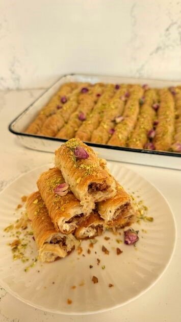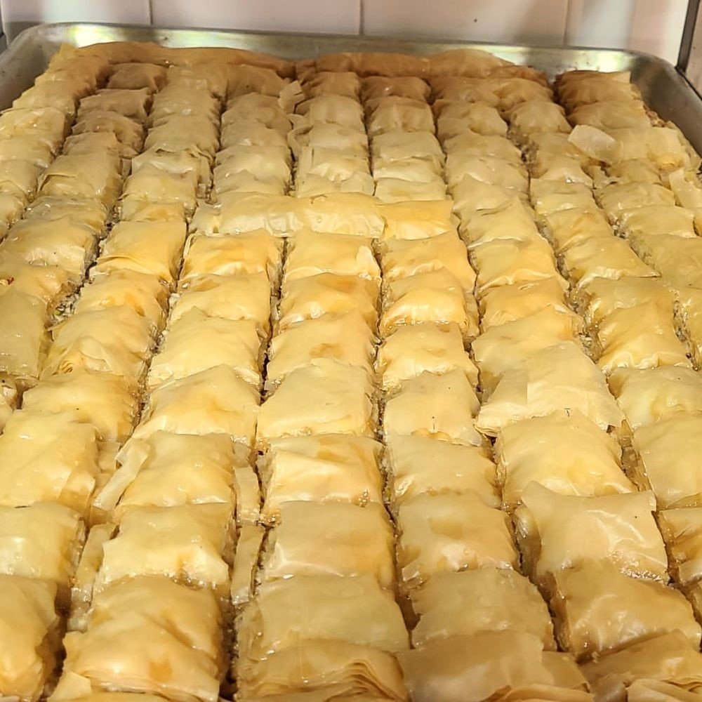Layers of thin phyllo pastry filled with chopped nuts, sweetened with honey or syrup.